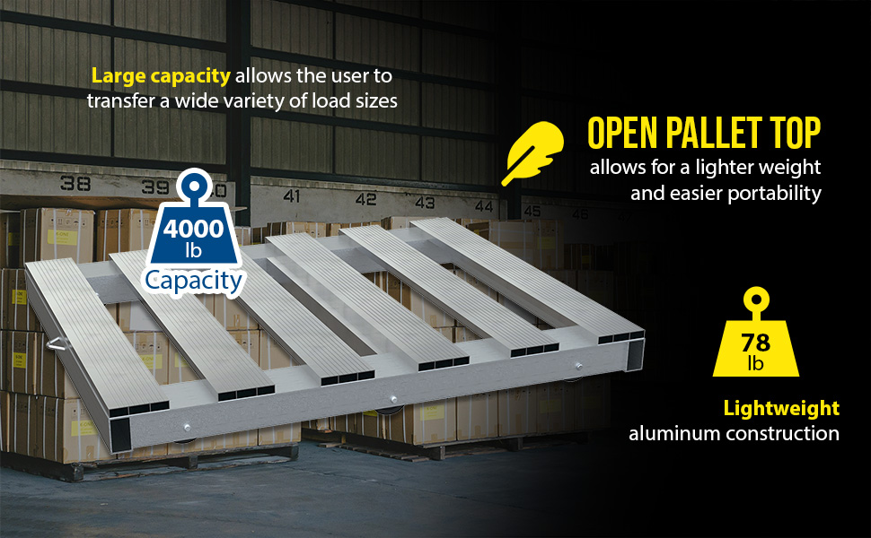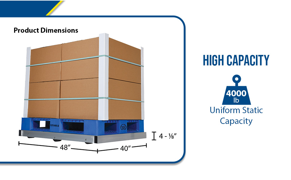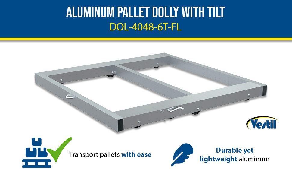 DOL-4048-6T DOL-4048-6TAluminum Pallet Dolly with Tilt 40 In. x 48 In. 4000 Lb. Capacity SilverUniform Static Capacity (lb.): 4,000
