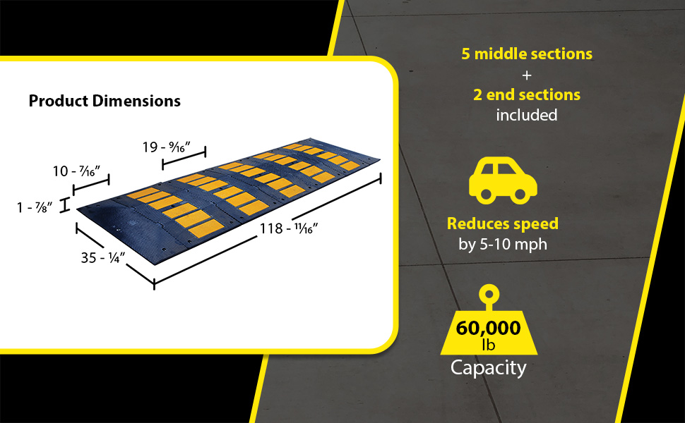RSH-120-36-A RSH-120-36-ARubber Speed Hump Asphalt Hardware 118-11/16 In. x 35-1/4 In. x 1-7/8 In. 60000 Lb. Capacity Black / YellowUniform Capacity (lb.): 60,000