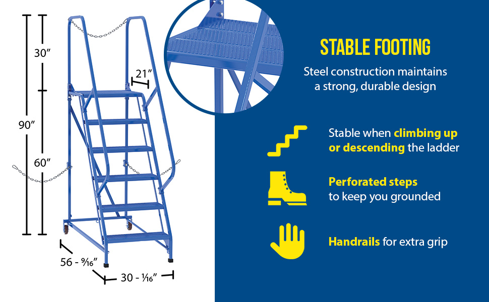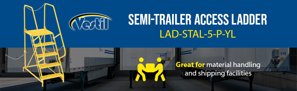 Semi-Trailer Access Ladders are for use getting into Semi-Trailers. Tilt the unit to allow for portability. Units roll on 4" poly-on-poly wheels. Constructed of square tubing framework which handles uniform capacities up to 350 lbs. Features 30" high removable hand railing, access chain, 21" deep top platform, and an industrial baked-in blue powder coat finish for toughness. Each step measures 24" wide by 7" deep and is spaced 10" apart. Climb Angle is 58 degrees. |