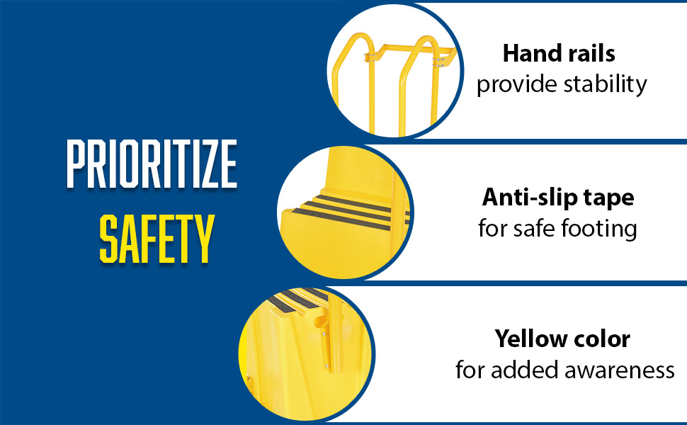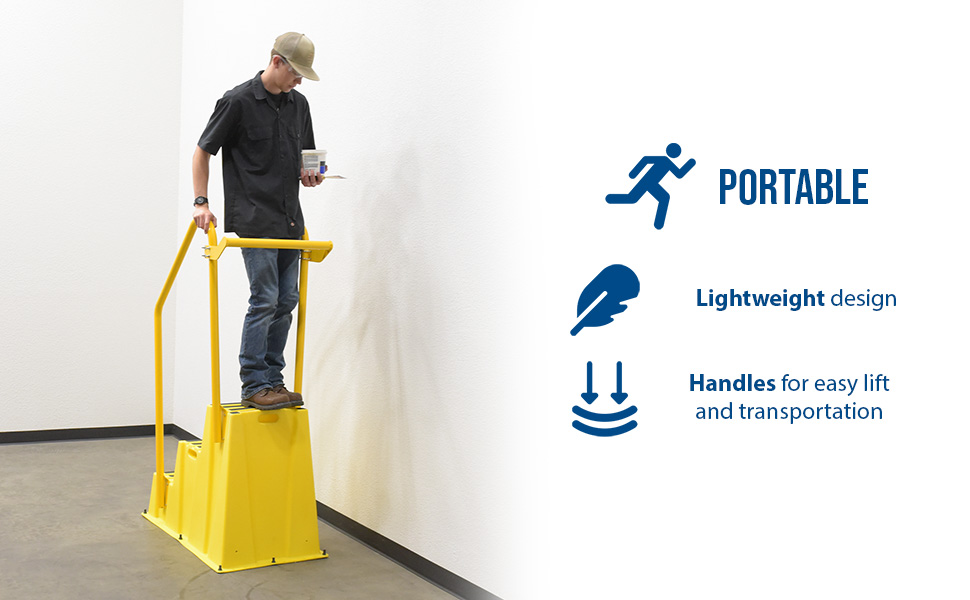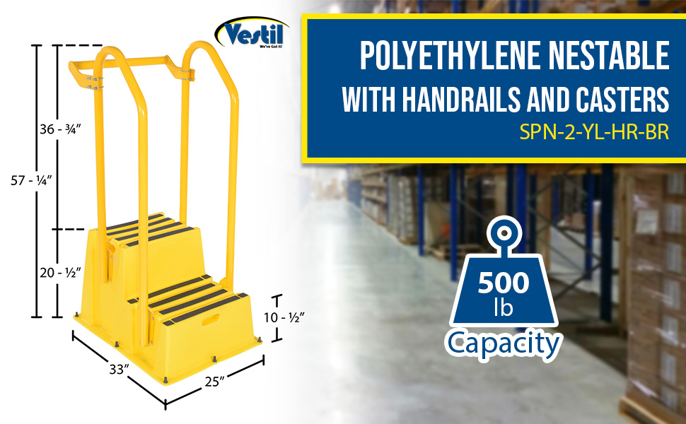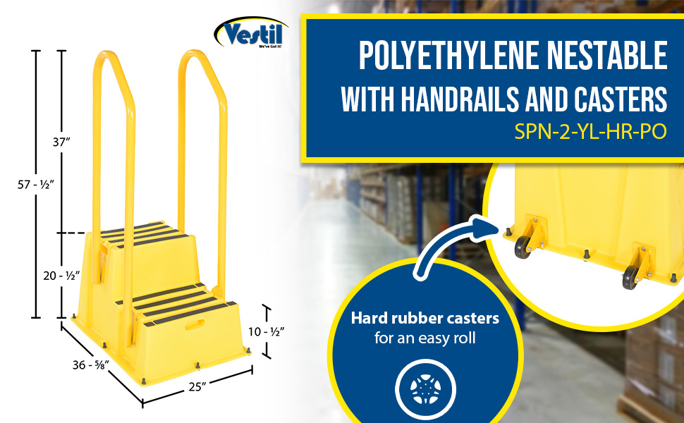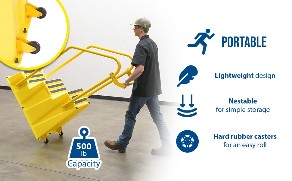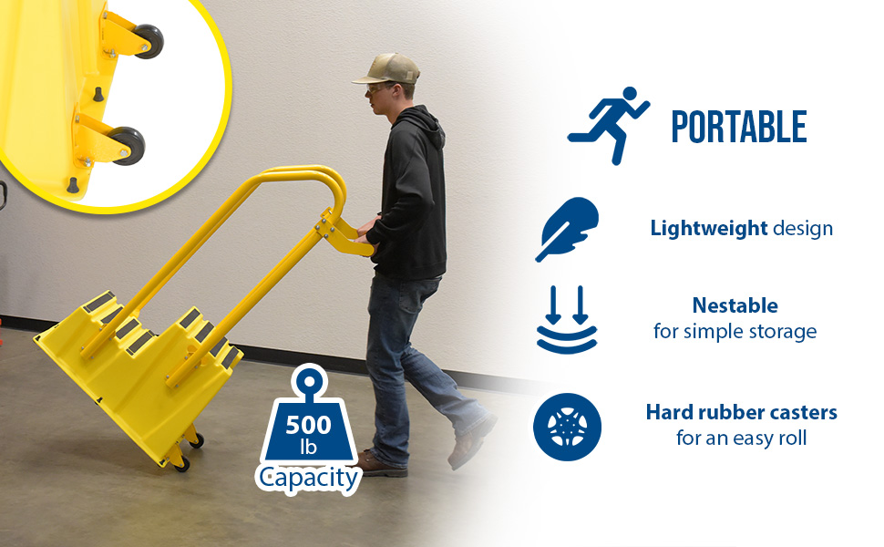 A poly step stool is a great asset for on the go or in a permanent setting. A lightweight design with front and side cutout handles, allow the user to easily transfer the stool to a preferred spot. The taped step surfaces ensure safe footing while traversing up and down the steps. Includes bolt on handrail and casters. The hand rails height allows the unit to be pushed or pulled into the desired position, minimizing bending and twisting by the user. Steps can be nested to minimize footprint when not in use.