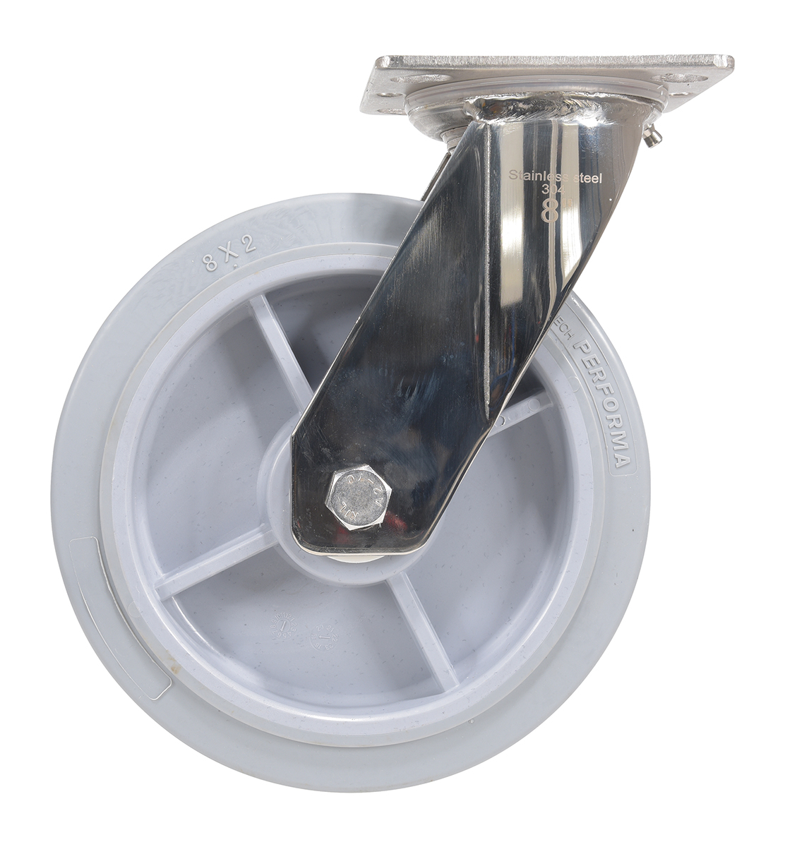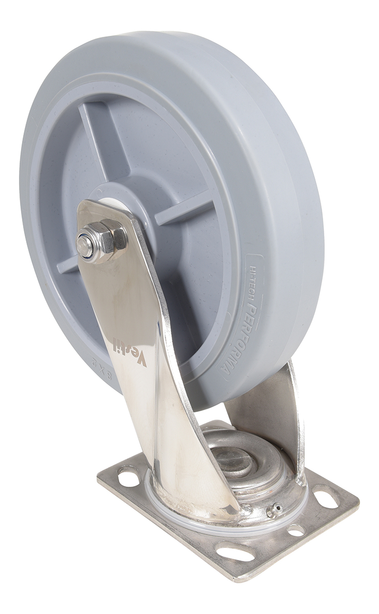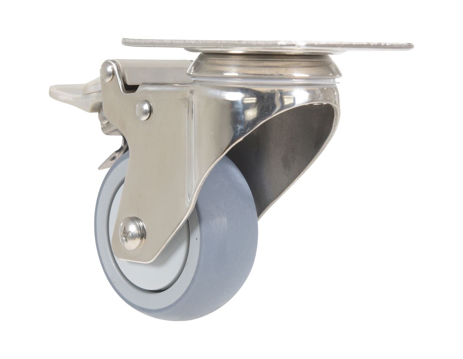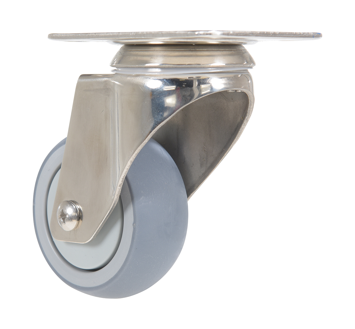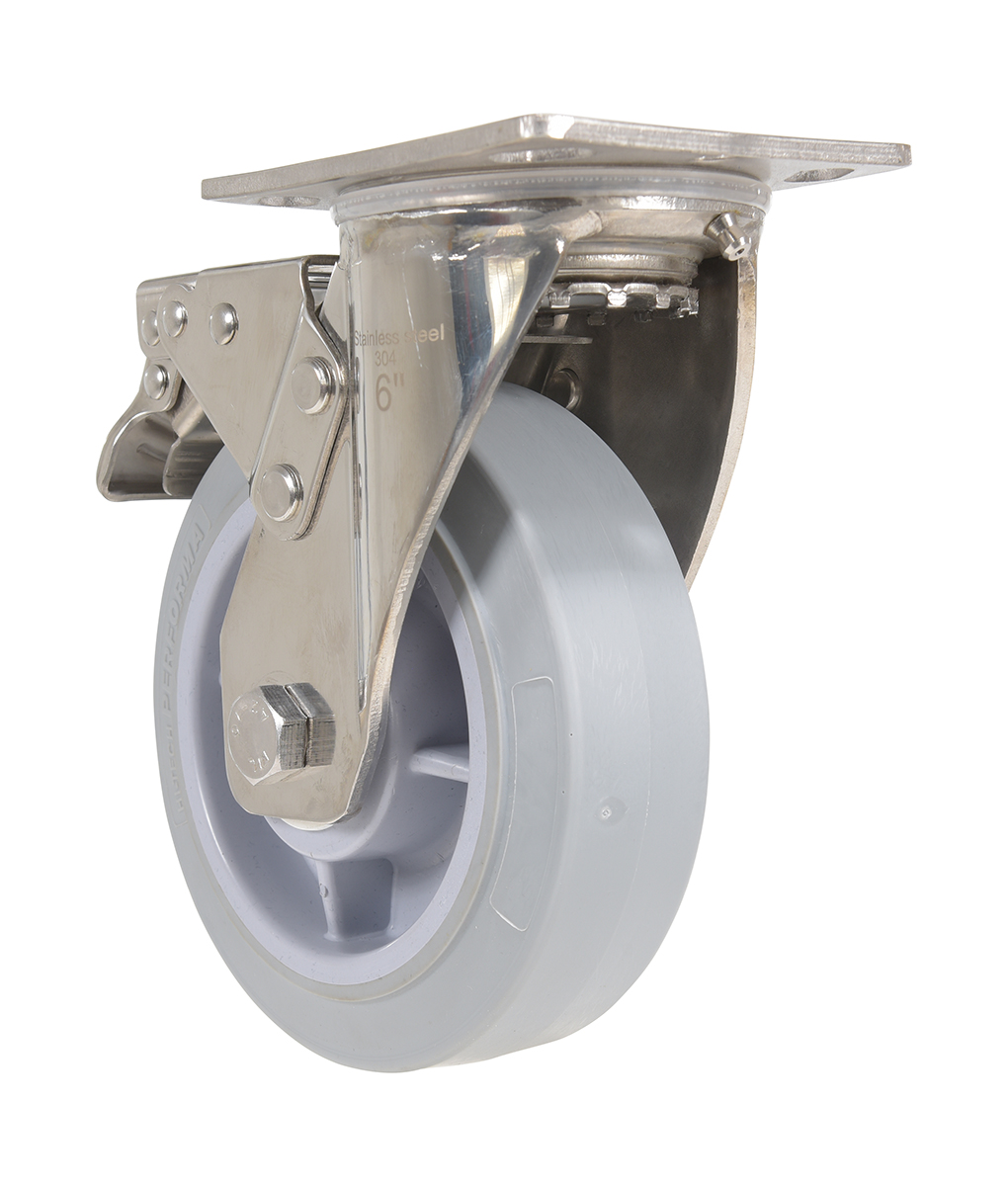 Stainless steel casters are excellent for corrosion resistance. They are ideal for applications where frequent wash downs are a necessity or have exposure to cleaning agents, steam, or other corrosive agents which could rust or corrode. Thermoplastic rubber (TPR) provides a smooth quiet ride with a non-marking tread. It offers great floor preservation and is resistant to most chemicals.