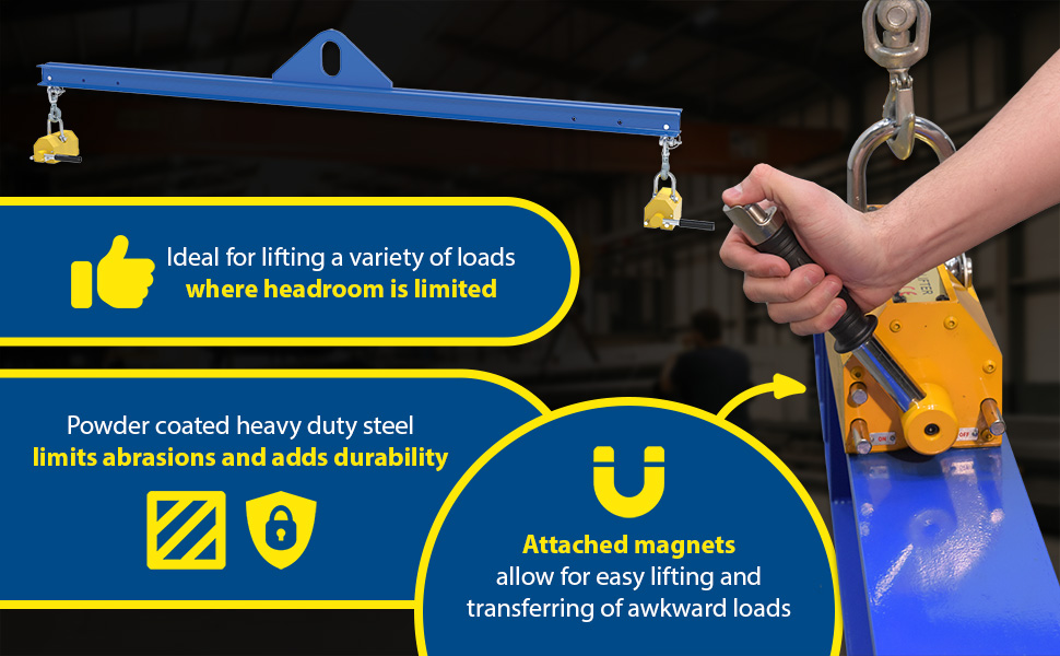 This versatile magnetic Spreader Beam is ideal for lifting a variety of loads where headroom is limited. The attached magnets allow for easy lifting and transferring of products from workstation to workstation. Powder coated finish limits abrasion and adds durability to the units' longevity.