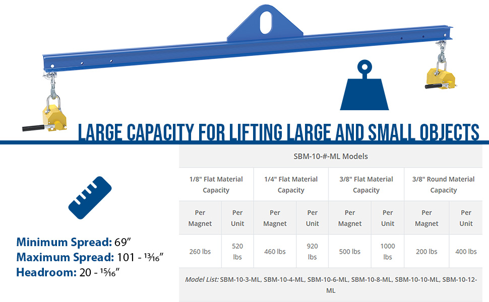 SBM-10-4-ML SBM-10-4-MLSteel Magnetic Spreader Beam 48 In Length 1,000 Lb. Capacity BlueUniform Static Capacity (lb.): 1000
