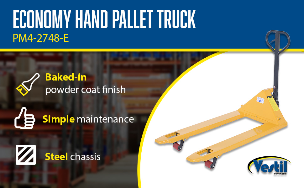The Vestil Economy Hand Pallet Truck delivers a robust and affordable solution for material handling needs across warehouses, loading docks, and manufacturing floors. Designed with a durable steel chassis and a smooth hydraulic lift, this pallet truck enables operators to easily raise pallets to ergonomic transport heights, with minimal effort and maximum safety. Its compact length and low-profile fork design allow for easy maneuvering in tight aisles and around equipment, while polyurethane or nylon load wheels provide reliability and longevity—even under demanding use.