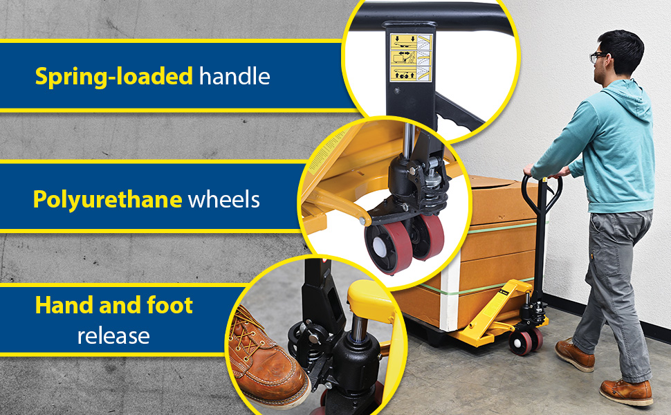 PM4-2748-E PM4-2748-ESteel Economy Pallet Truck Hand and Foot Release 62 In. x 29 In. x 48 In. 4,400 Lb. Capacity YellowUniform Capacity (Lbs.): 4,400