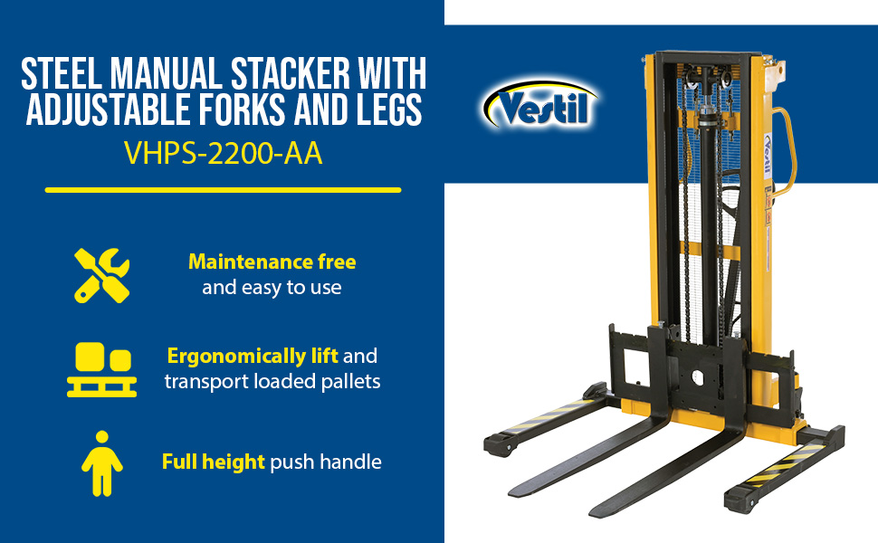 | Steel Manual Stacker Adjustable Forks/Legs 2,000 Lb. Capacity Black / Yellow | Uniform Capacity (lb.): 2,000 Service Range (in.): 2-1/8 to 63 | 860 |
