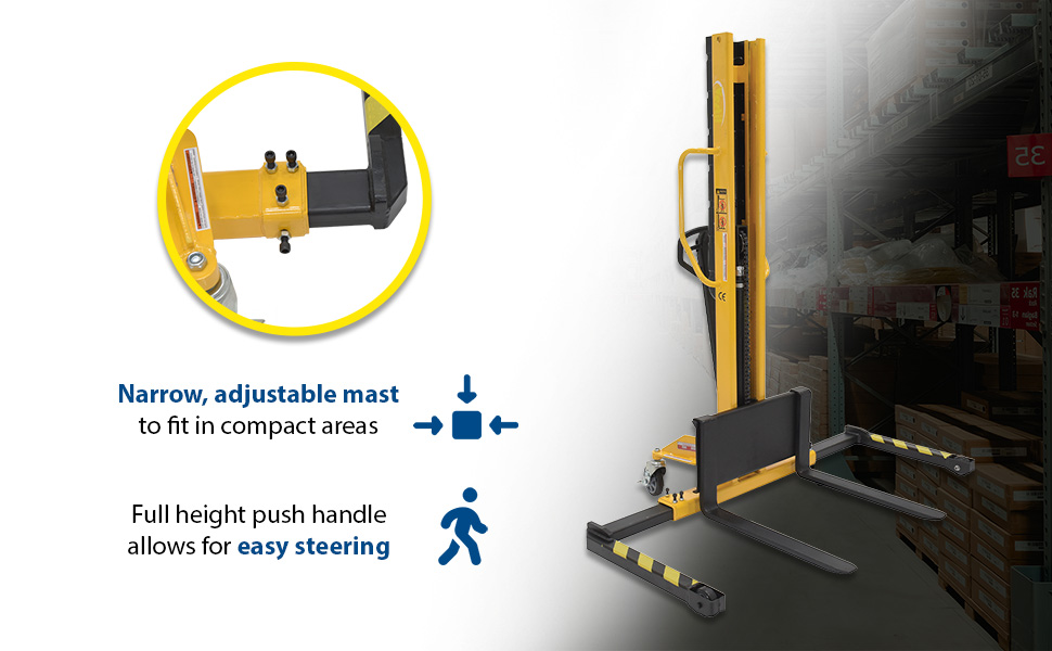 | Steel Manual Stacker Narrow Mast Adjustable Forks/Legs 1,000 Lb. Capacity Black / Yellow | Uniform Capacity (lb.): 1,000 Service Range (in.): 2-1/8 to 62 | 472 |