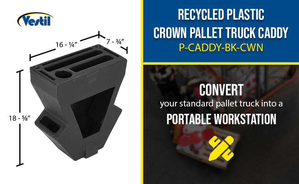 P-CADDY-BK-CWN P-CADDY-BK-CWNRecycled Plastic Crown Pallet Truck Caddy 7-3/4 In. x 16-1/4 In. x 18-5/8 In. BlackBrand / Model Compatibility: Pallet Trucks