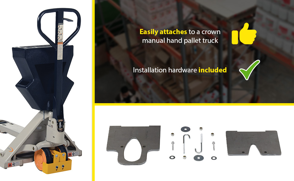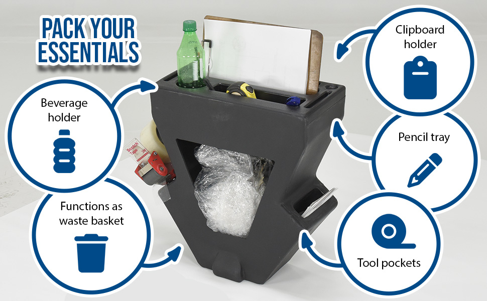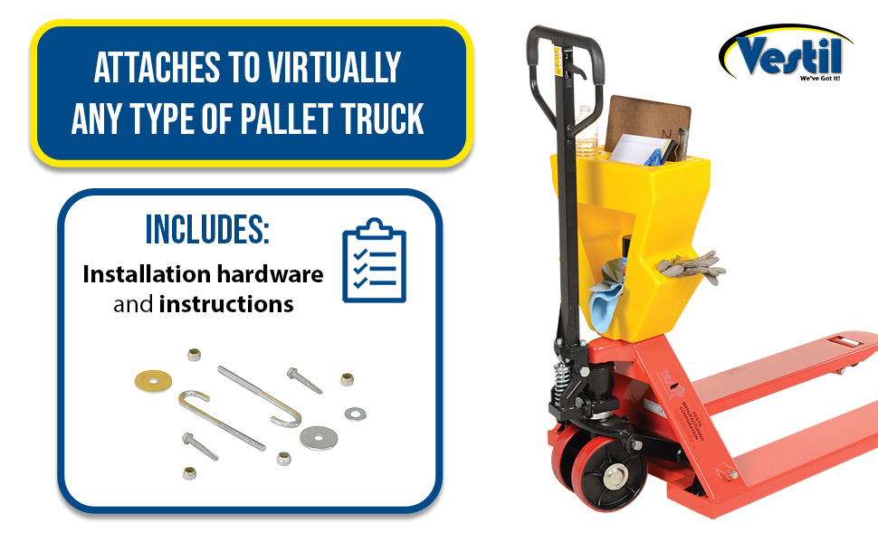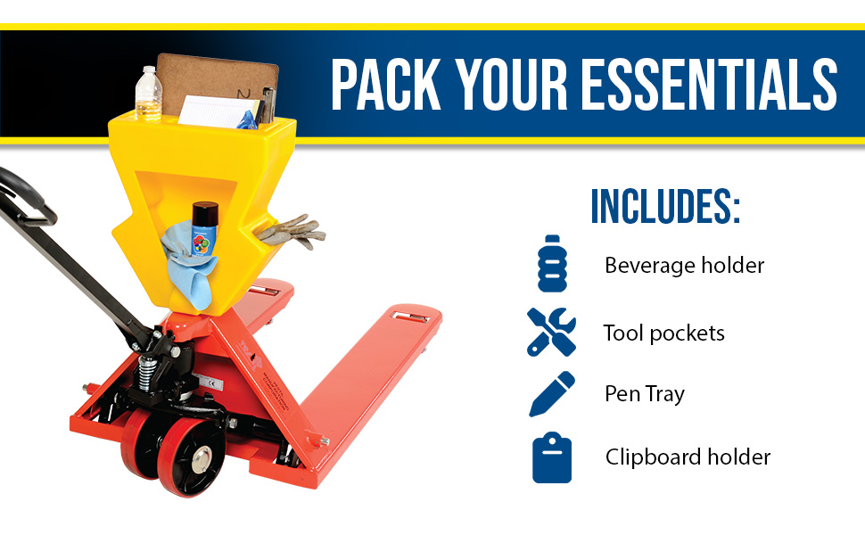 P-CADDY-BK_K.jpgThis economical product will convert a standard pallet truck into a portable workstation in minutes. It has been designed with user efficiency and convenience in mind. Easily attaches to virtually any type of pallet truck with hardware included. Features beverage holder, tool pockets, pen and pencil tray, and clipboard holder. Contact us if you have a Crown manual pallet truck.