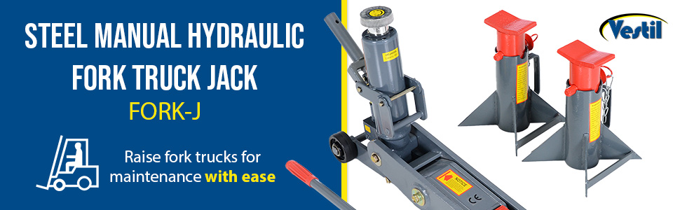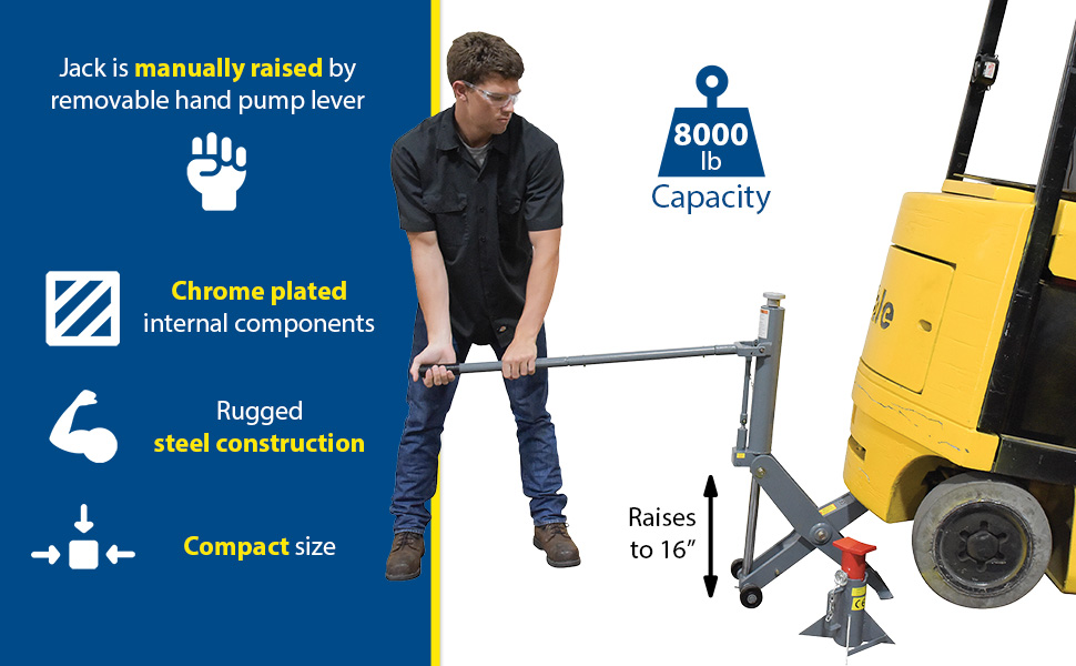 Manual Hydraulic Fork Truck Jack Designed to raise your fork truck for maintenance. Features high-quality seals, chrome plated internal components and rugged steel construction. Maximum lift of 16" provides room needed to perform a variety of repairs. Manually raised by hand pump lever. Removable handle and compact size makes it easy to maneuver and transport. Includes two jack stands (13 ton capacity per pair), with holding pins for adjustable heights.