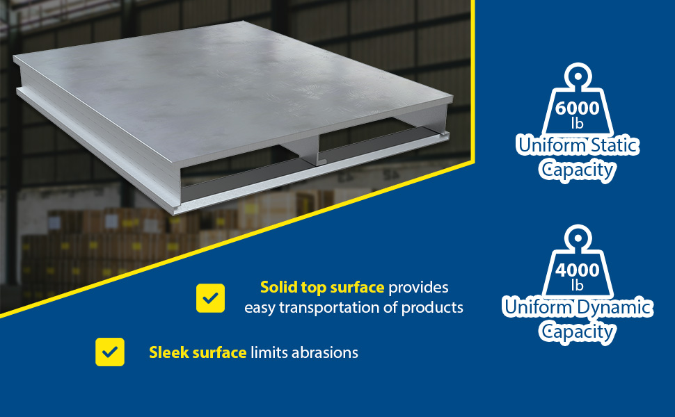 | Aluminum Solid Top with Skid Bottom 40 In. x 48 In. 6000 Lb. Capacity Silver | Static Capacity (lb.): 6,000 Dynamic Capacity (lb.): 4,000 | 113 |