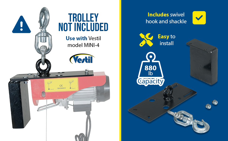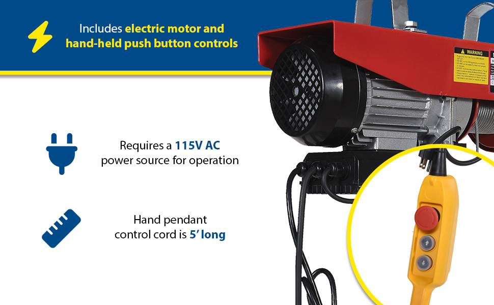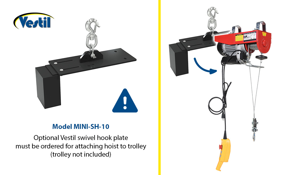 Use in single-line and double-line lifting applications. Cable length is 36' when used as a single-line - 18' when used as a double-line. Includes electric motor and hand-held push button controls. Installation bracket will fit on 1-5/8" round pipe or 1-5/8" square tubing. Optional Swivel Hook Plate must be ordered for attaching hoist to a trolley (trolley not included).