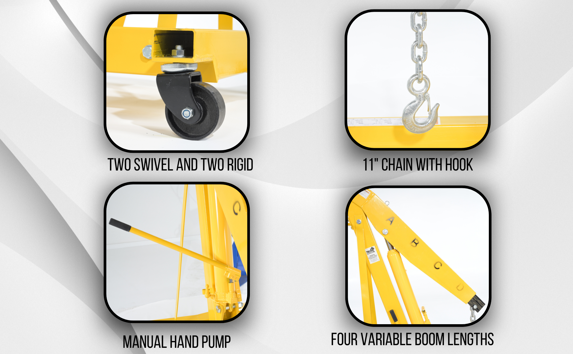 EHN-60-GThese portable units are great for hundreds of lifting applications. Telescopic boom for multiple lifting heights and capacities. Boom is raised and lowered with a manual hydraulic hand pump. The high-capacity hydraulic cylinder provides for faster lifting action and features a large diameter ram to withstand angled loads when lifting. Includes two rigid and two swivel casters for portability. Heavy-duty steel construction and painted finish.
