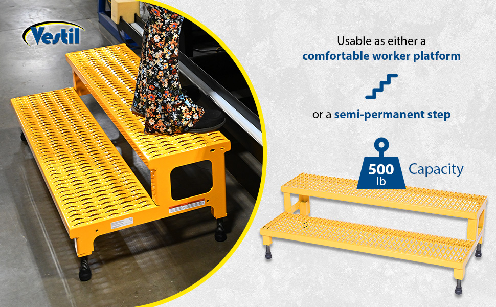 Our Adjustable Step-Mate Stands can be used as either a comfortable worker platform or a semipermanent step. Individual step size is 11-3/4" deep, aluminum construction 11-7/8" deep. Grip strut surface ensures safe footing. Legs adjust individually by screwing them into or out of the leg base. Welded construction. Uniform capacity 500 pounds. Steel units feature a yellow baked-in powder-coated toughness.