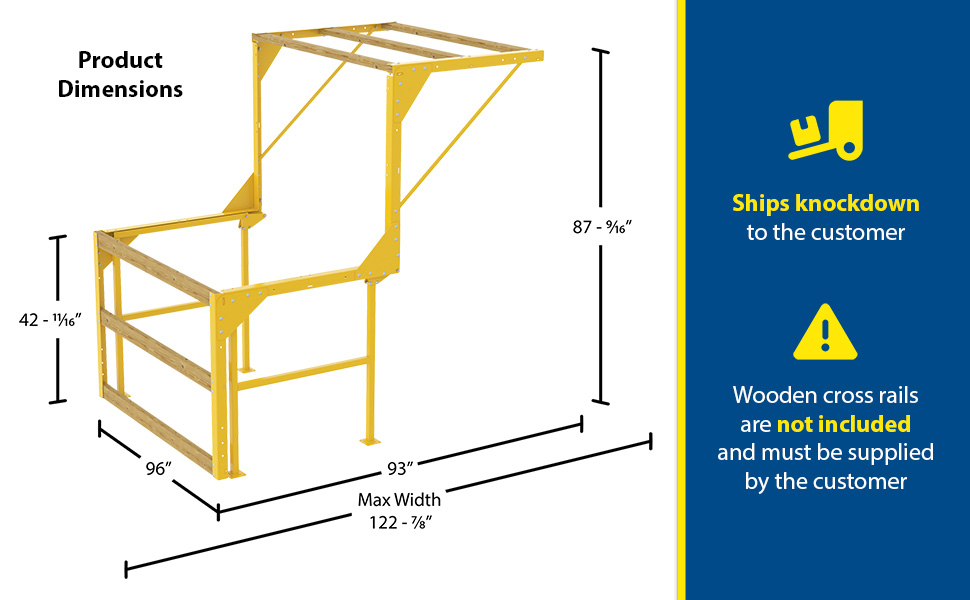 The MEZZ-KD-88T-93D ships knockdown to the customer. The 6 wooden cross rails are not included and must be supplied by the customer. Cross rails can have a maximum overall length up to 96"