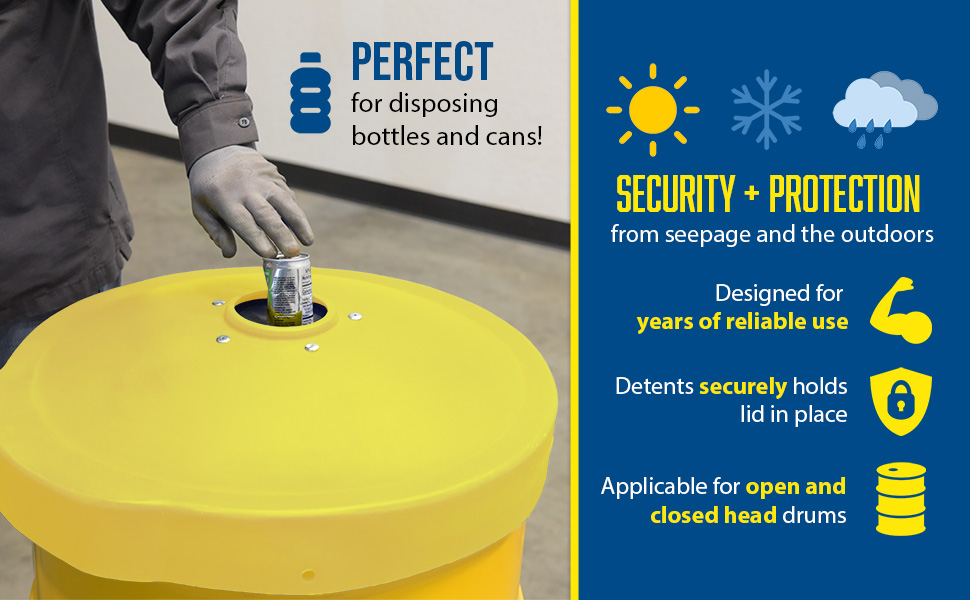 Collecting aluminum cans or plastic bottles could not be easier with Recycling Lids. Fits on open head plastic or steel drums only with lid and ring are removed. Low-density polyethylene construction. Fits snug to resist blowing off in outdoor environments or being tampered with by people or animals. CANF models have a flap to help discourage the removal of contents.