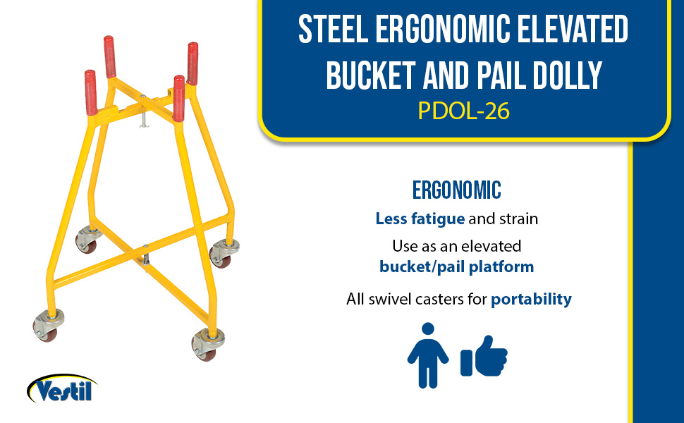 Unique dolly features elevated bucket/pail platform for better ergonomic position. Elevated platform allows for better posture during use, which leads to less fatigue and strain. For use with maximum 10-9/16" diameter round buckets. Also works with square buckets and boxes with maximum size 10-9/16" x 10-9/16". Design folds flat easily for storage when not in use. Portable on four (4) swivel poly casters. Steel construction with a yellow baked-in powder-coated toughness.