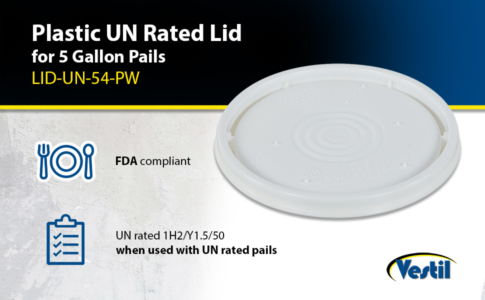 LID-UN-54-PW LID-UN-54-PWPlastic UN Rated Lid 5 Gallon WhiteAccommodating Pail Size (gal.): 5