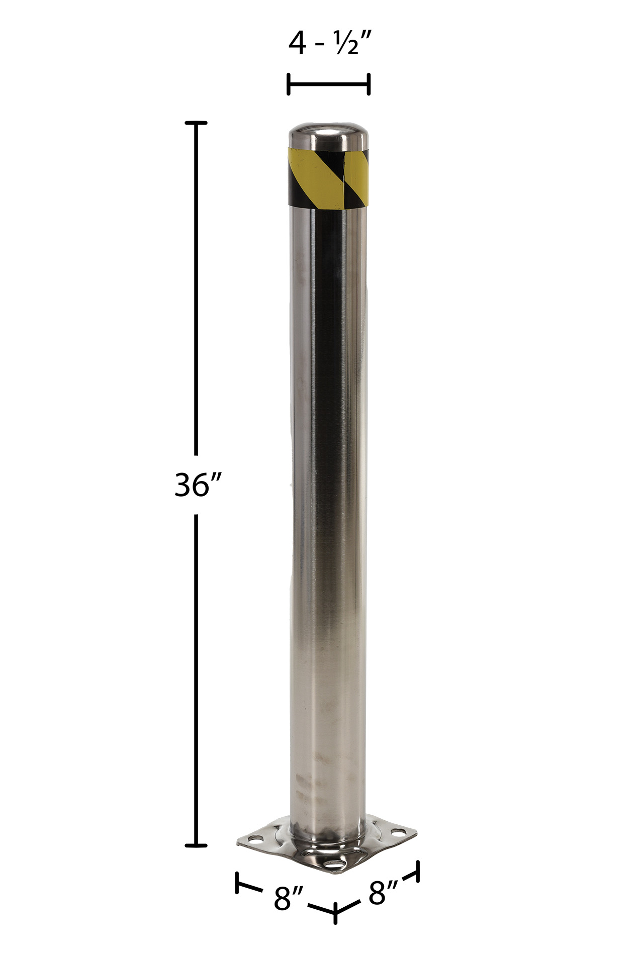 The Stainless Steel pipe safety bollard protects work areas, racking and personnel. Stainless Steel caps are welded on. Base plate is welded on. (Mounting hardware not included).