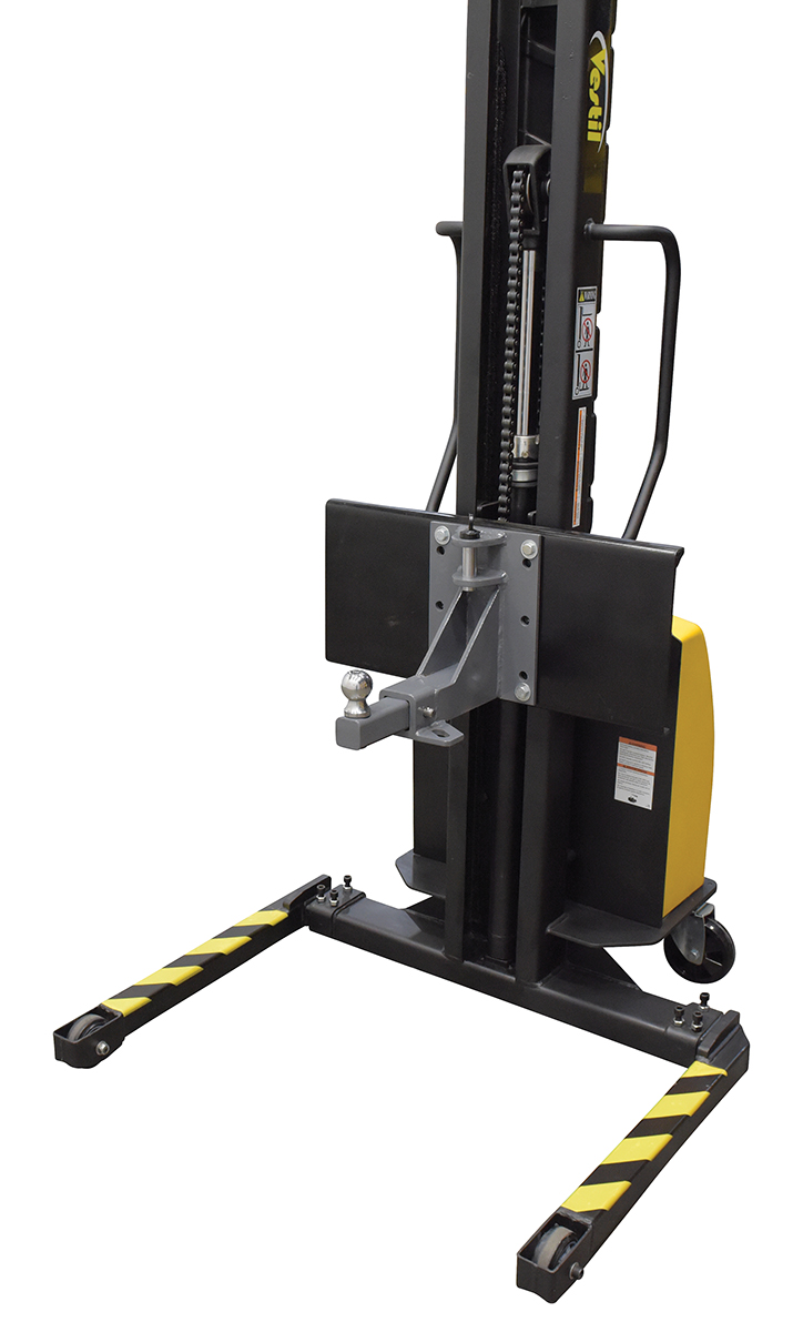 A single ball hitch is a durable accessory for the counter balanced powered lift. The unit as a whole is attached to the mast of the lift with a bolt and nut connection. With a unique design style, the hitch can be secured into and disconnected from the receiver with ease. An additional pin, secures the hitch into place minimizing any jostling or movement. The hitch is extended away from the mast of the unit giving much needed space when maneuvering the hitched products. Black powder coat finish for baked in added toughness.