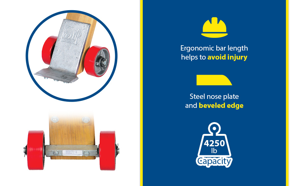 Provide dock workers, riggers, and freight handlers with the leverage needed to get underneath heavy objects for transporting with fork truck, hand truck, pallet truck, or machinery movers. Two (2) 5" x 2" poly-on-steel wheels. 5/8" thick steel nose plate with beveled edge is bolted on the wood handle units and welded on the steel units. Steel units feature baked-in powder-coated toughness.
