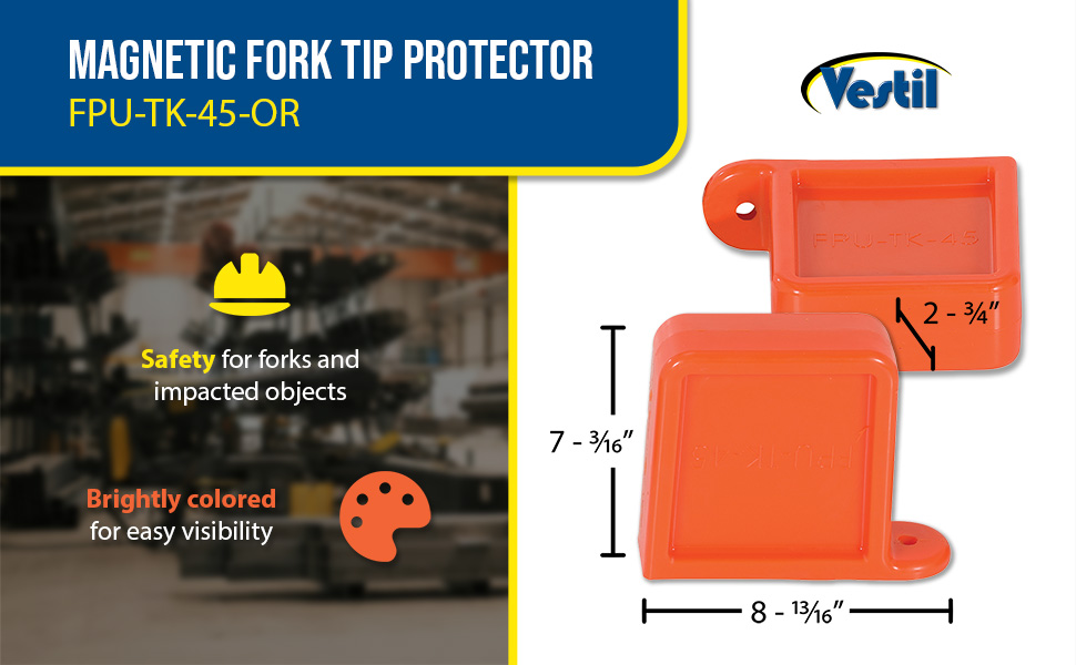 FPU-TK-45-M-OR FPU-TK-45-M-ORThick Polyurethane Magnetic Fork Tip Protector 5-5/8 In. x 3/4 In. Fork Pocket OrangeFork Pocket Width (in.): 5.625