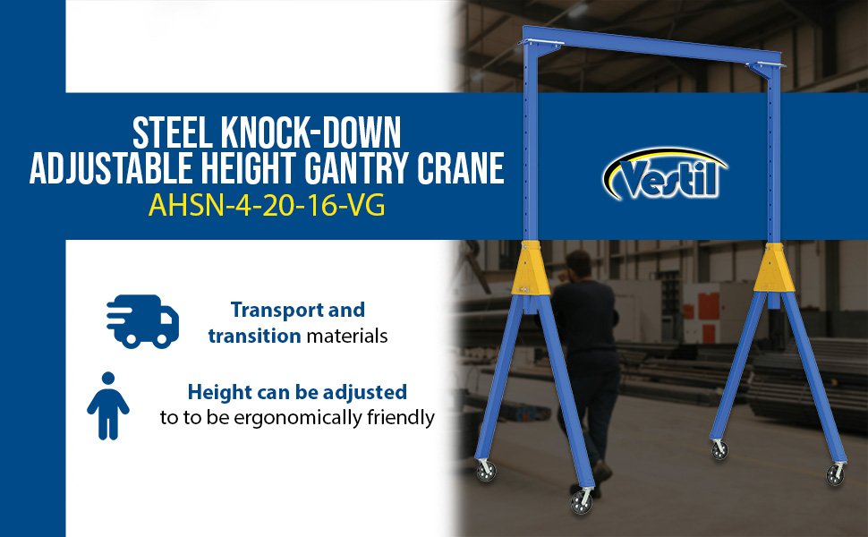 | Steel Knock-Down Adjustable Height Gantry Crane with V-Groove Cast Iron Casters 20 Ft. Wide x 14 Ft. Max Usable Height 2,000 Lb. Capacity Blue | Uniform Capacity (lb.): 2,000 Adjustable Clearance Range (in.): 102 to 168 | 839 |