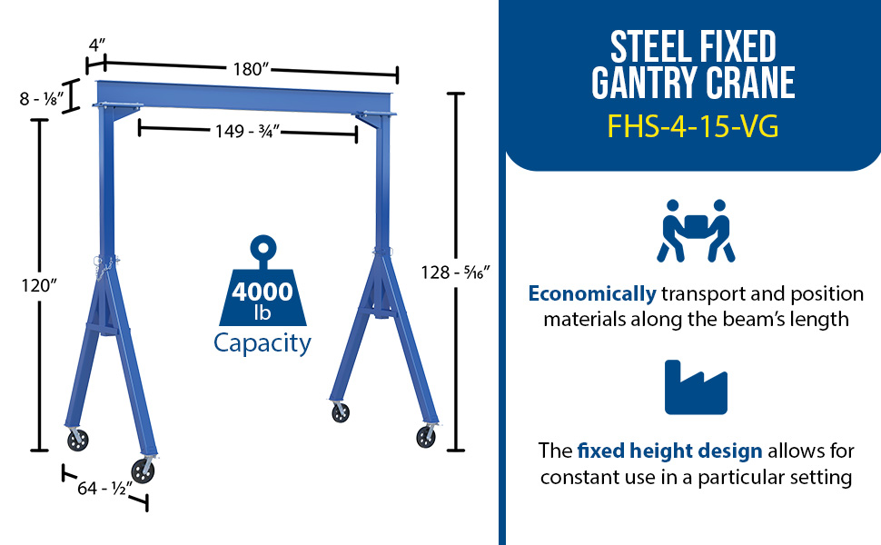 The fixed height steel gantry crane is designed for transporting and positioning materials along the beams length. The solid steel construction will provide years of service, while the painted blue finish will keep the models protected from surface ware. Unit comes standard four (4) V-groove casters, allowing for quick movement and positioning adjustments. The unit is an economical and efficient way to lift and raise products, diminishing the need of additional personnel. The fixed height design allows for constant use in a particular setting without the need to maneuver the overall height of the unit.Do not move units while loaded unless using V-Groove Caster and Track Option. Hoists & Trollies can be ordered seperately.