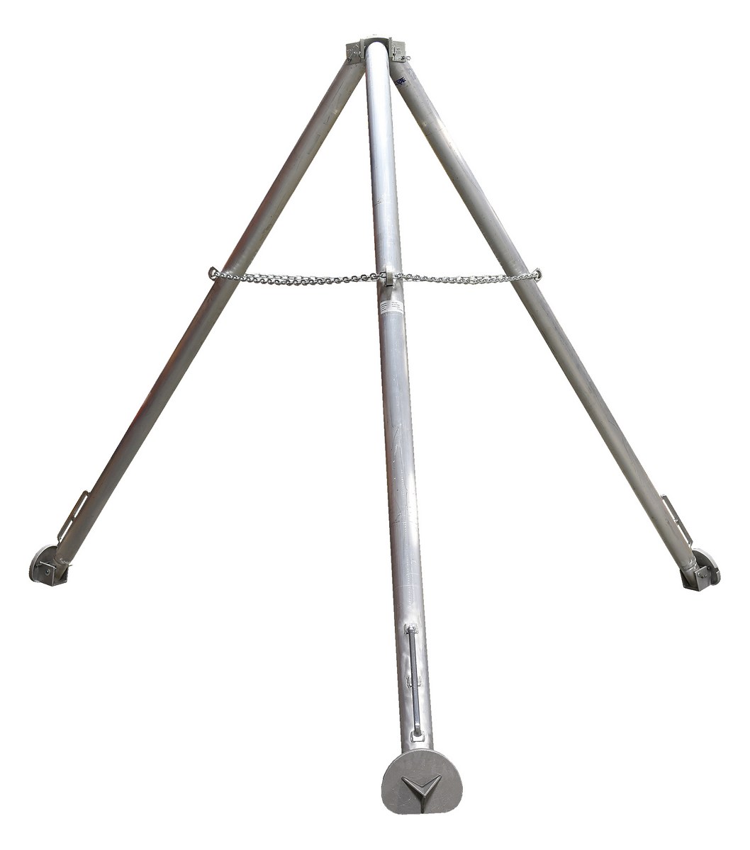 This portable steel or aluminum tripod hoist stand provides a convenient and economical lifting support stand. Available in adjustable or fixed height versions. The unit folds for convenient portability and storage. Great for access to confined spaces. Features padded pivots for smooth or spiked feet. The spiked feet are designed to be used in rough terrain. A swivel eye bolt and safety chain are standard. Chain hoist not included. Meets ANSI safety requirements for confined space Z117.1.