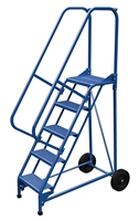 Portable ladders conveniently folds for storage. Constructed of square tubing framework which handles capacities up to 350 lbs. 4 step - 11 step models feature a 30" high removable hand railing. 12 step models feature a 36" removable hand railing and 14" deep top platform. Standard models feature a 58 degree climb angle, while models ending with suffix "-EZ" have a 50 degree climb angle. Each step measures 16-13/16" wide by 7" deep and is spaced 10" apart. Models with 8 - 12 steps have steps that measure 23-9/16" wide. Unit rolls around on two large 10" x 2-1/2" hard rubber wheels. Units are shipped crated, some assembly required. Complies with ANSI 14.7 and OSHA 1910.29 specifications.