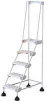 LAD-5-B-P_E.jpgCommercial users of rolling ladders now have an attractive and economical alternative to the traditional warehouse rolling ladders. This sleek design also provides maximum safety and convenience. The all directional spring-loaded swivel casters feature steel dome protection which include rubber pad bottoms to minimize movement. Climb angle is 58 degrees. The top step is 16" wide by 11" deep while the remainder steps measure 16" wide by 8" deep. The powder coat finish provides a durable attractive appearance. Capacity is 300 pounds.