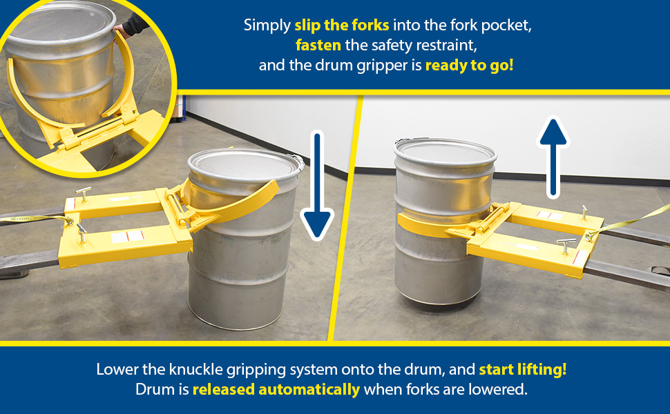 The Drum Gripper makes it easy to pick up one or two open head (with lid installed and secured) and closed head steel drums without leaving the seat of the fork truck. Simply slip the forks into the fork tubes, fasten the safety restraint and the Drum Gripper is ready to go. The knuckle gripping system is lowered around the drum, gripped tightly, and then lifted into the air. Drum is automatically released by lowering the forks. All models feature hinged folding design for storage. Safety restraint included. Welded steel construction with a baked-in powder-coated toughness.