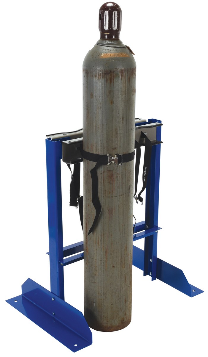 Our Cylinder Bracket Stands allow for storage of cylinders in the vertical position. The straps are included for securing the cylinders to the stand. The CB-ST models have pre-drilled mounting holes for attachment to the floor (floor mounting hardware is not included). Stands are powder-coated blue and steel brackets feature a gray painted finish. Assembly hardware included.