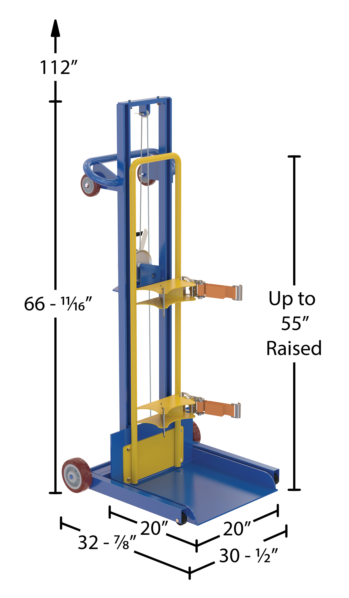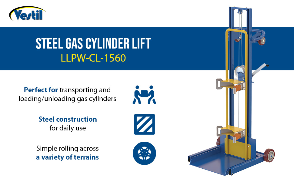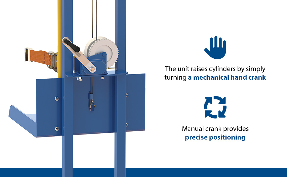 Perfect for transporting gas cylinders and loading them onto a truck. This unit raises cylinders by simply turning a mechanical hand crank to the desired height. Maximum cylinder diameter 11-1/2" x 56" tall. Cylinder is held in place with a tough polyester webbing strap that guards against damage and slipping.
