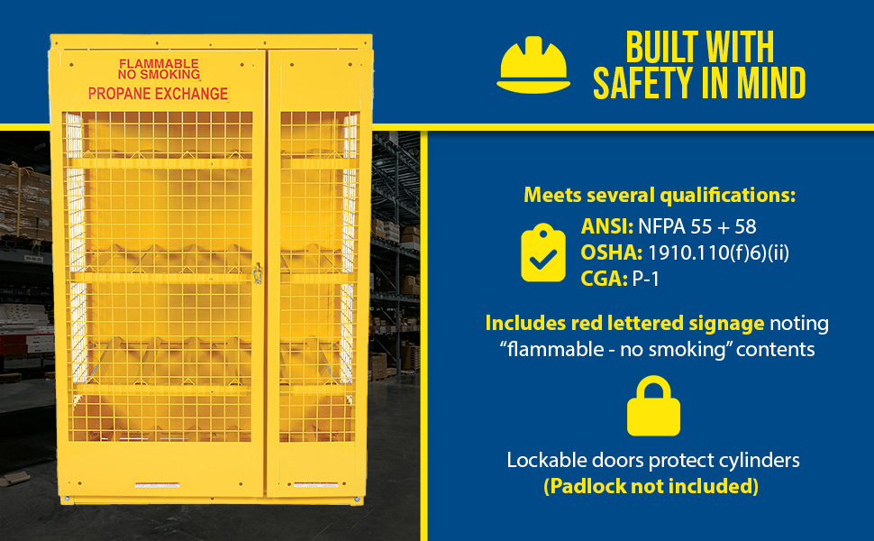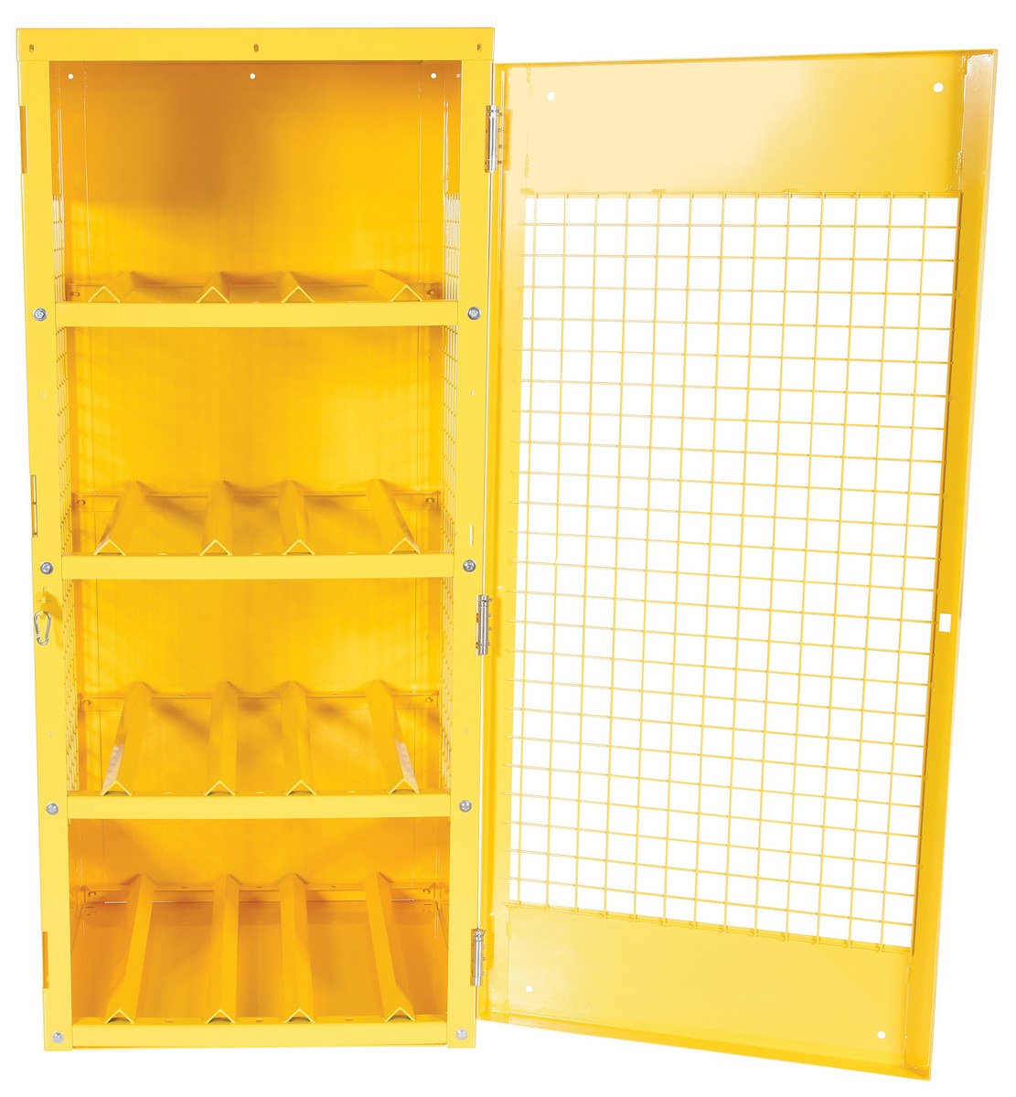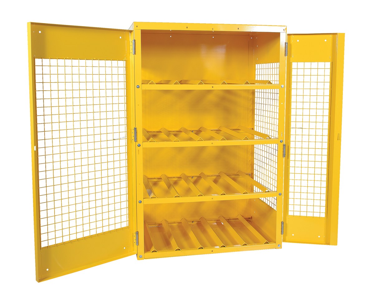 Steel cabinets for storage of cylinders. Cylinder storage capacity is based on cylinder size. Sides are made of expanded steel for an open view design. The top, back, and bottom is made of solid sheet steel. Lockable doors protect cylinders (padlock not included). Base includes lag holes for securing cylinders. Vertical units include chains for securing cylinders. Includes red lettered signage noting "Flammable-No Smoking" contents. Meets OSHA 1910.110 (f)(6)(ii), ANSI NFPA 55 + 58 and CGA P-1 design standards. Rugged steel construction with a baked-in powder coated safety yellow finish for toughness. Knock down versions available, suffix -KD Check out Vestil's Other Storage Cabinets: