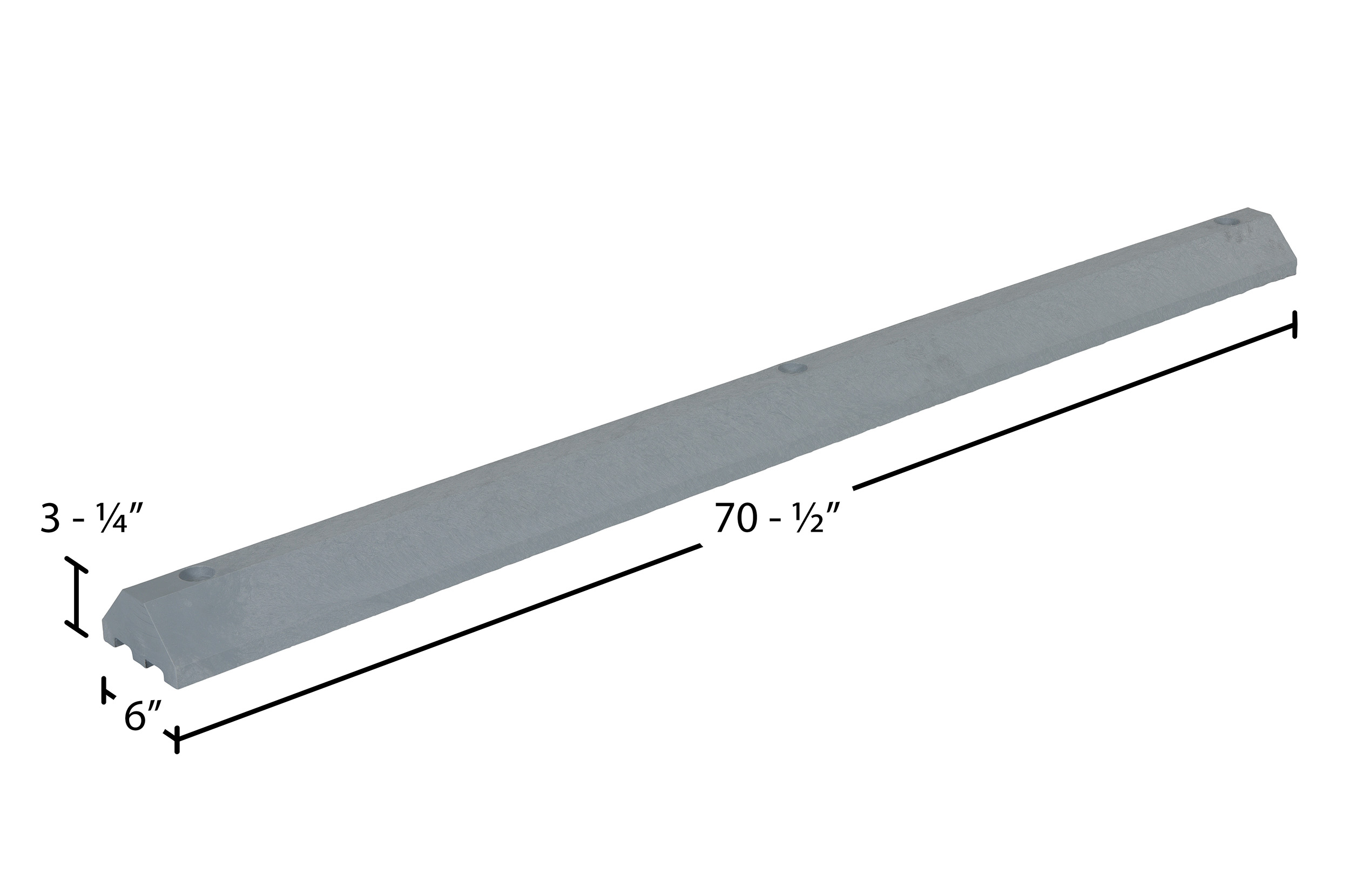 Recycled Plastic Car Stop 72 In. x 6 In. x 3-1/4 In. GrayThe car stops protect people and property from drivers in dangerous areas. Constructed of lightweight plastic. One person installation. Can be moved for seal coating, snow removal, change of location. Resists marring by oil, road salt, sunlight, and chemicals. Resists rotting, termite damage and corrosion. No costly painting or maintenance. Hardware kits sold separately.