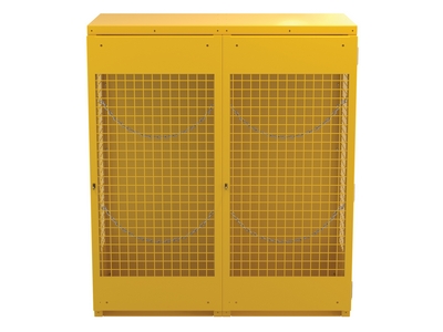 Steel cabinet for storage of cylinders. Cylinder storage capacity is based on cylinder size. Sides and door are made of expanded steel mesh. Bottom, back and top is made of solid sheet steel. Lockable doors protect cylinders (padlock not included). Base includes lag holes for securing cylinders. Includes red lettered sign age noting "flammable - no smoking" contents. Rugged steel construction with safety yellow finish. Powder coat finish.