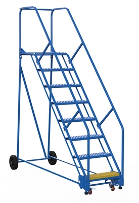 Steel Rolling Warehouse Ladder 50 Degree 8 Grip Strut 23-9/16 In. Step Width 350 Lb. Capacity BlueThe warehouse ladders are a great addition to the material handling and shipping facilities. The strong welded construction is powder coated for a sleek reliable finish that will stay durable throughout daily use. The ladder construction promotes safety through a bottom yellow step that indicates the end of the unit. The unit can be locked in place by pressing the levers below the bottom step. Once levers are engaged the ladder cannot be moved. A resilient handrail offers stability while climbing and exiting the ladders.