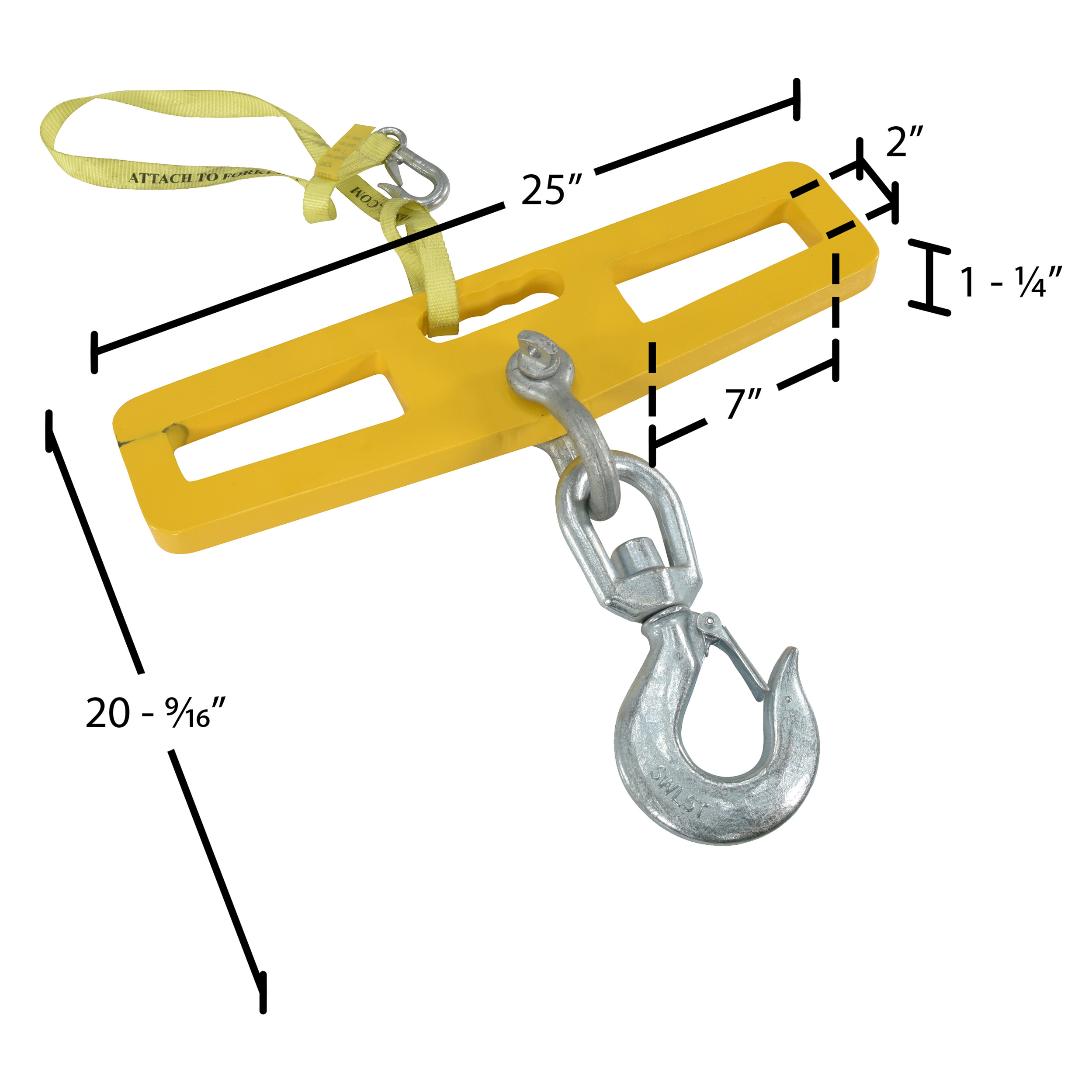 Steel Fork Truck Hook Plate Swivel with Latch 10,000 Lb. Capacity YellowA lift-master hook plate is wonderful asset for securing and lifting heavy loads. With a strong steel construction the lift is easily maneuvered by utilizing the two fork slots. A centrally located hook and latch are also included for simple securing of the product being lifted. A sleek, compact design takes up minimal room when not in use. A centered built in handle is great for lifting and moving by hand.