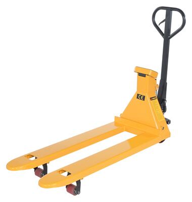 A low profile pallet truck is an economical way for one person to move heavy pallet loads without the use of a fork truck. With a scale included, items can be weighed and moved all in one unit. This brings efficiencies to warehouses and shipping areas, while bypassing the traditional time consuming weigh areas. The casters (two steer and four rollers) give the pallet truck quick movement and smooth turn-ability. The forks are built of steel and are powder coated yellow.