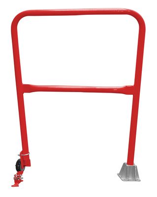 Steel Dock Safety Swing Gate 3 Ft. Length RedEconomical safety swing gates are an economical way to protect people from dock falls. Durable railings are constructed from schedule 10 pipe (1-5/8" O.D.). Units have a top rail height of 46-1/4" and a 25" mid-rail. 4" poly-on-poly wheel allows units to be swung out of the way. Cast single socket is included.