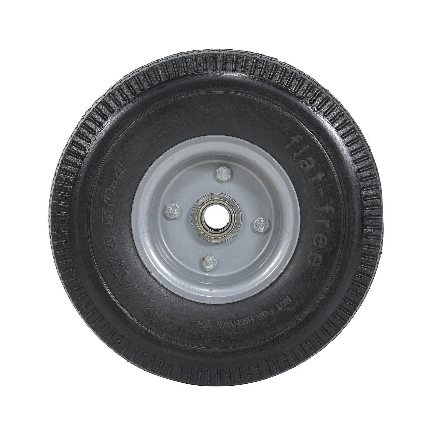 Polyurethane Solid Foam Wheel 10 In. Diameter 300 Lb. Capacity BlackUrethane foam wheels provide a sound base for traversing both even and uneven surfaces. The foam construction will always be ready for the job, unlike other less dependable pneumatic models that have the potential of being flat, just when there is work to be done. With a simple connection to a cart or hand truck, upgrade with a foam filled wheel today!